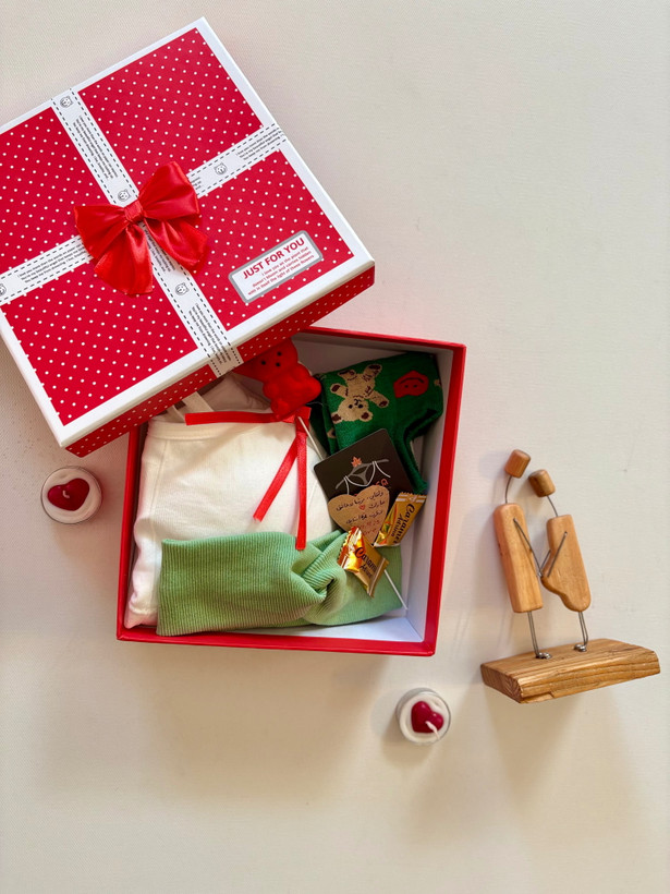 شامل 👈🏻نیمتنه کراپ پشت ضربدری، جوراب زیرقوزکی تدی،هدبند کبریتی سبز، عروسک خرسی قرمز،هارد باکس کادویی قرمز