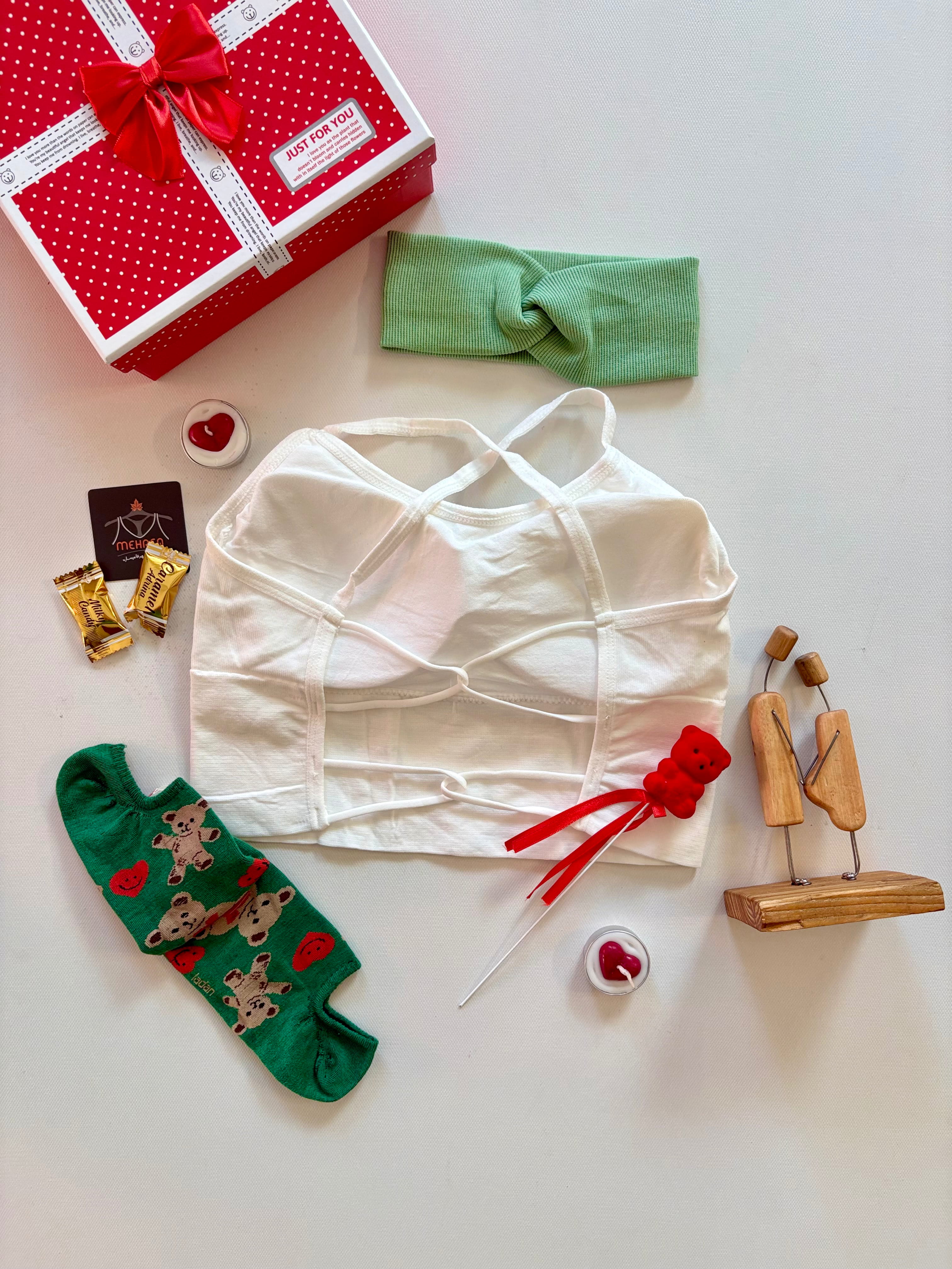 شامل 👈🏻نیمتنه کراپ پشت ضربدری، جوراب زیرقوزکی تدی،هدبند کبریتی سبز، عروسک خرسی قرمز،هارد باکس کادویی قرمز