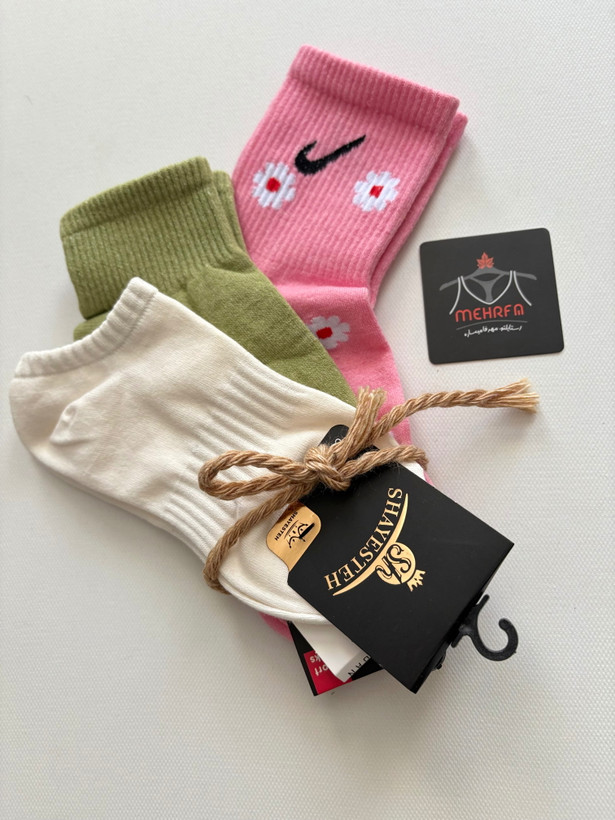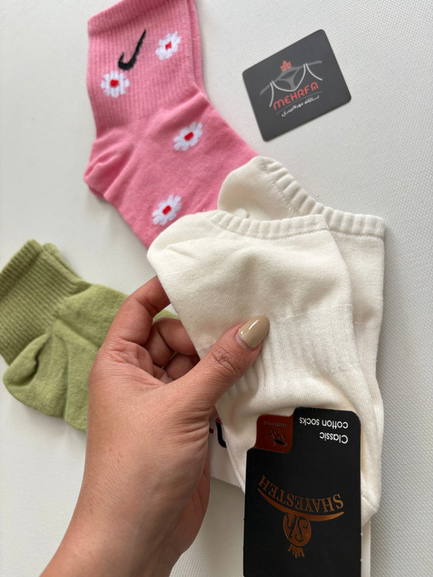 شامل : جوراب ساق دار صورتی نخ هندی،جوراب مچی شیری نخ پنبه ، جوراب نیم ساق سبز نخ پنبه