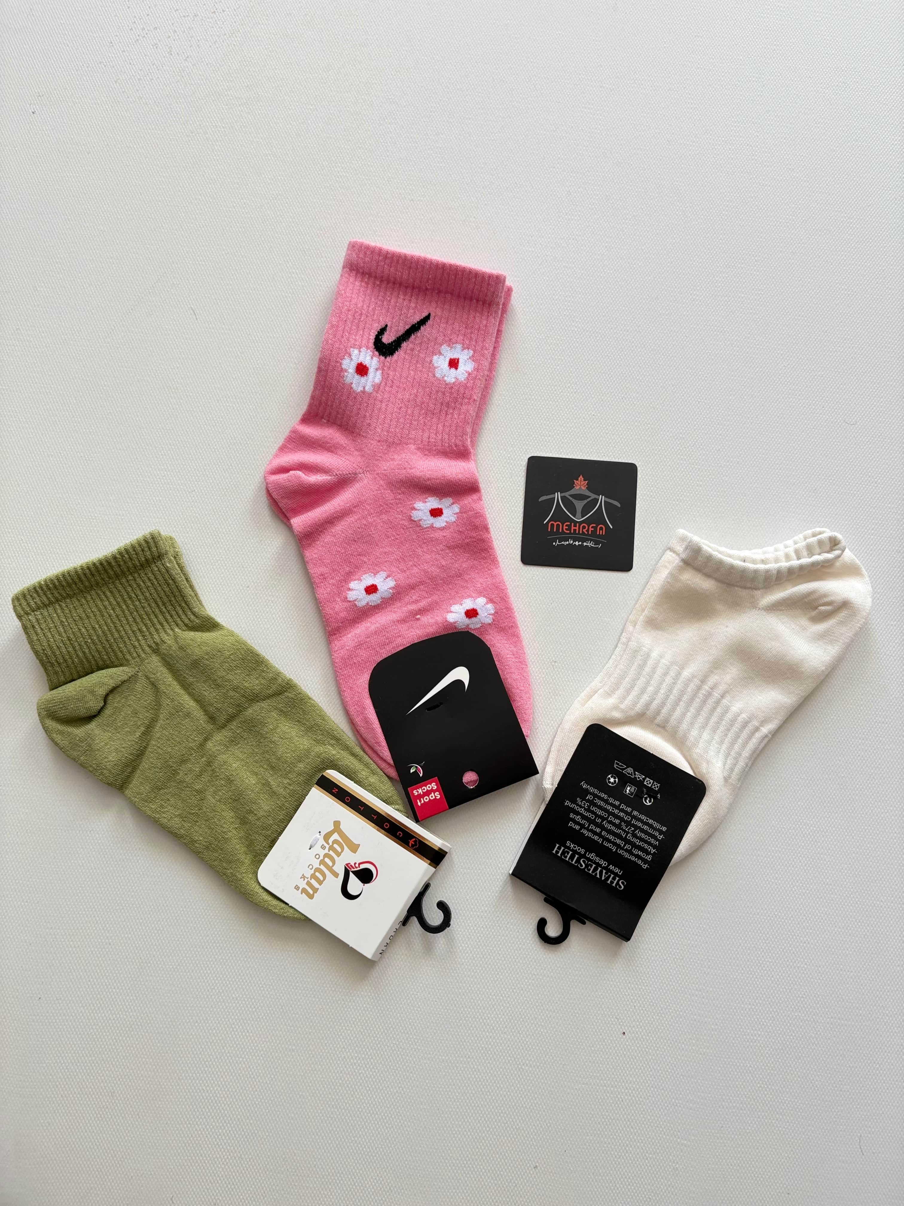 شامل : جوراب ساق دار صورتی نخ هندی،جوراب مچی شیری نخ پنبه ، جوراب نیم ساق سبز نخ پنبه
